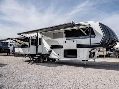 Sleeps 8 Slides 4 Length 41 ft 9 in Ext Width 8 ft Ext Height 13 ft 4 in Int Height 6 ft 8 in Hitch Weight 2591 lbs GVWR 17695 lbs Dry Weight 14859 lbs Fresh Water Capacity 75 gals Grey Water Capacity 90 gals Black Water Capacity 45 gals Tire Size 215/75 R17.5 Furnace BTU 35000 btu Number Of Bunks 1 Available Beds King Refrigerator Type 12V Energy Efficient Refrigerator Size 16 cu ft Cooktop Burners 3 Shower Size 30" x 42" Number of Awnings 2 Axle Weight 8000 lbs LP Tank Capacity 30 lbs. Water Heater Type Tankless On Demand AC BTU 45000 btu TV Info LR 50" Telescoping TV, Bonus Room 50" Smart TV, BR 32" Smart TV Awning Info 11' & 21' w/LED Lighting Axle Count 2 Washer/Dryer Available Yes Number of LP Tanks 2 Shower Type Standard Similar Fifth Wheel Floorplans
