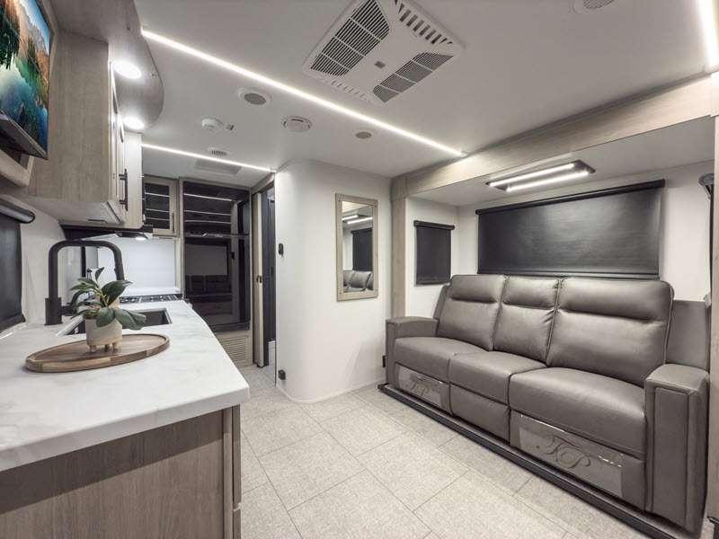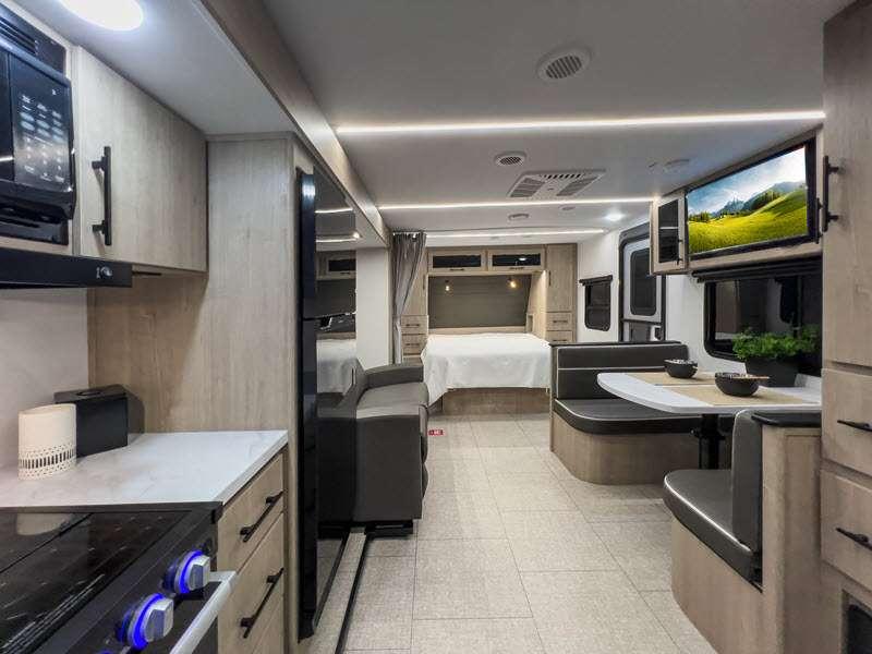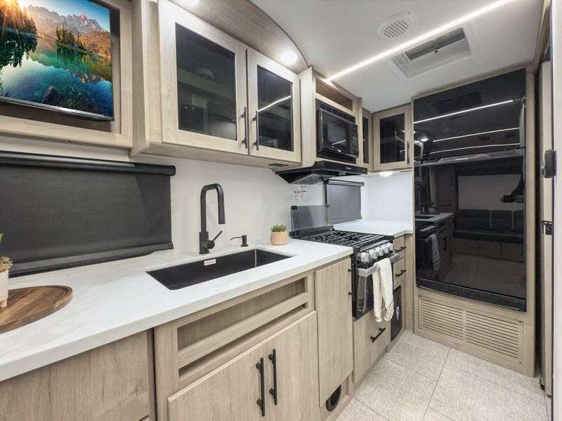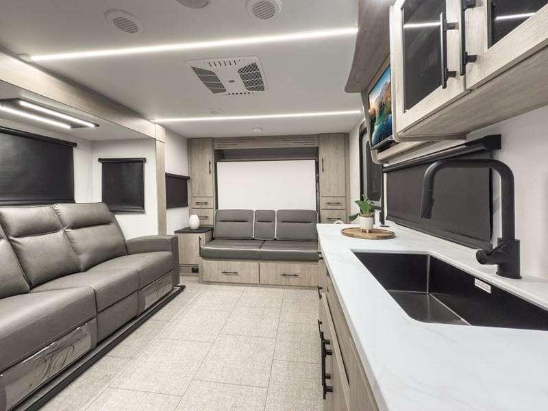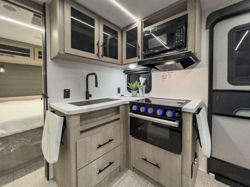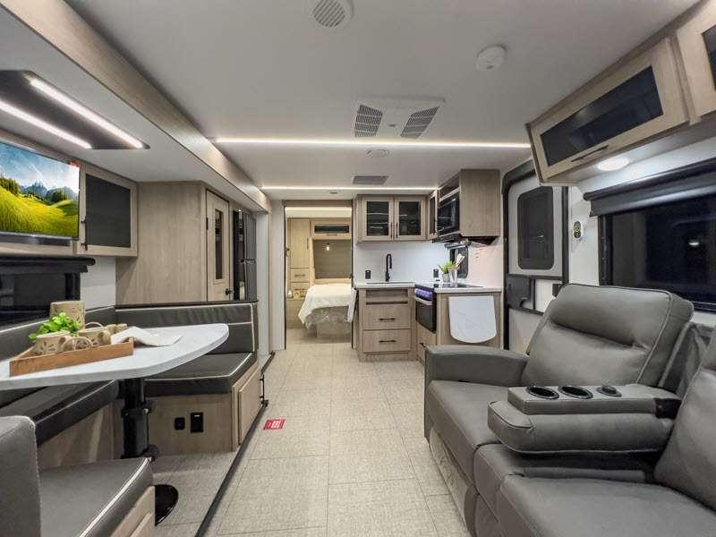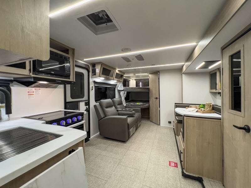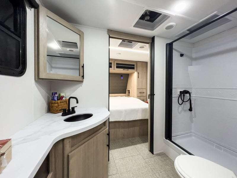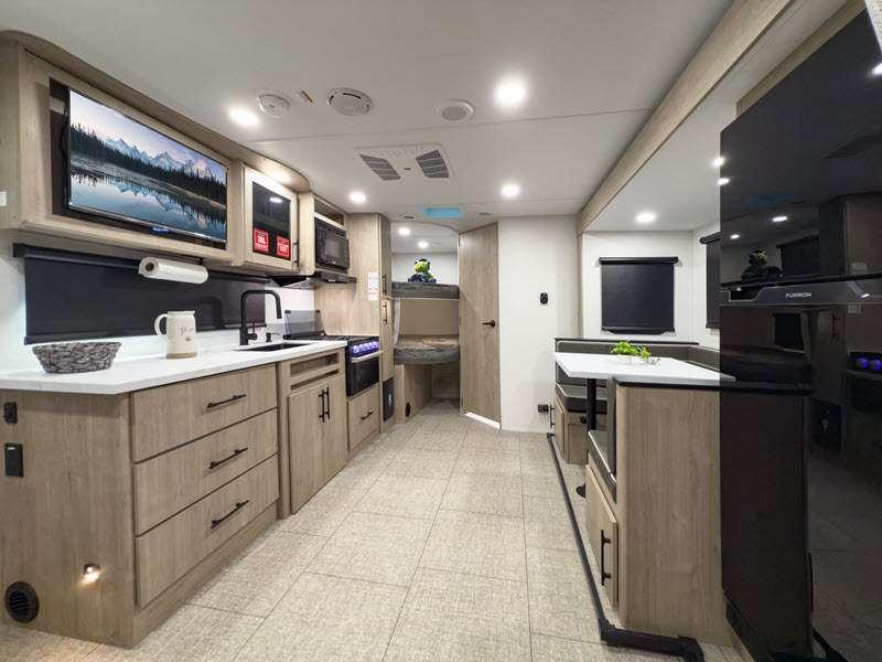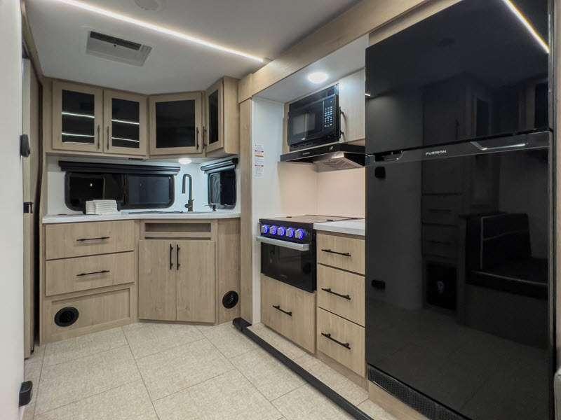 The gel-coated fiberglass exterior and one-piece roof membrane form the base that holds all of the many features, like the three-burner range with an oven, residential walk-in shower, high capacity furnace, and LED HDTV. The friction-hinge entry door won't fly away when you open it, and the residential countertops will let you set down dinner plates. There is a large panoramic window and LED lighting to keep your trailer feeling open, and the four packages included will provide even more features you won't want to camp without. Some of these features include a 200W solar panel, an accessory hitch, and a full width pass-thru storage!